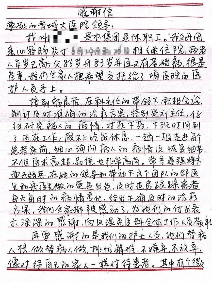 一封手寫(xiě)感謝信,點(diǎn)贊晉城大醫(yī)院風(fēng)濕免疫科!