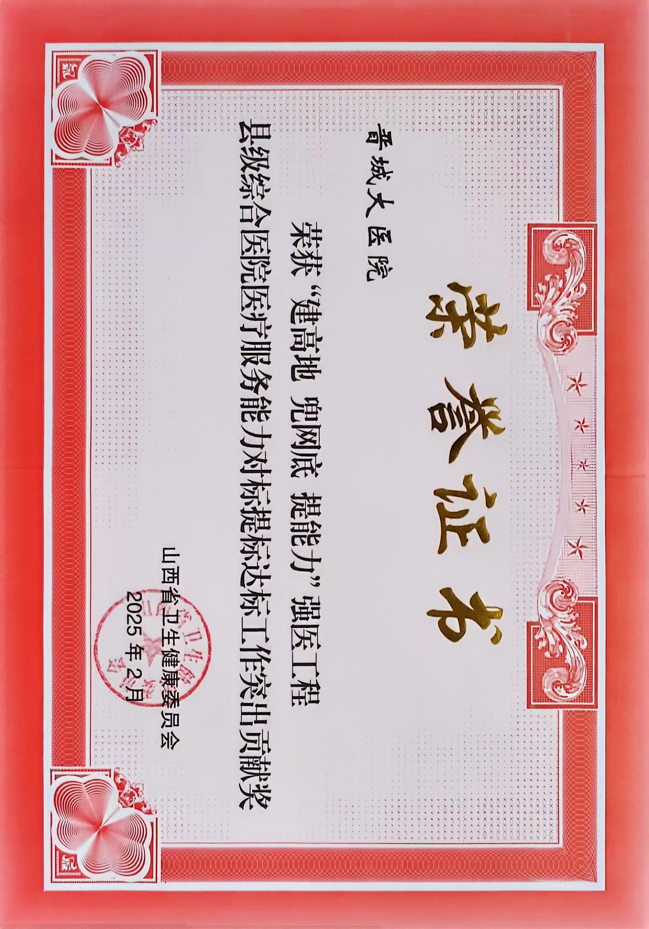晉城大醫(yī)院榮獲山西省衛(wèi)健委“建高地、兜網底、提能力”強醫(yī)工程縣級綜合醫(yī)院醫(yī)療服務能力對標提標達標工作突出貢獻獎